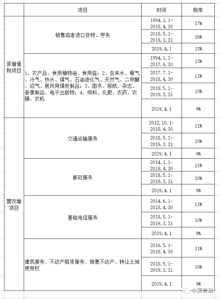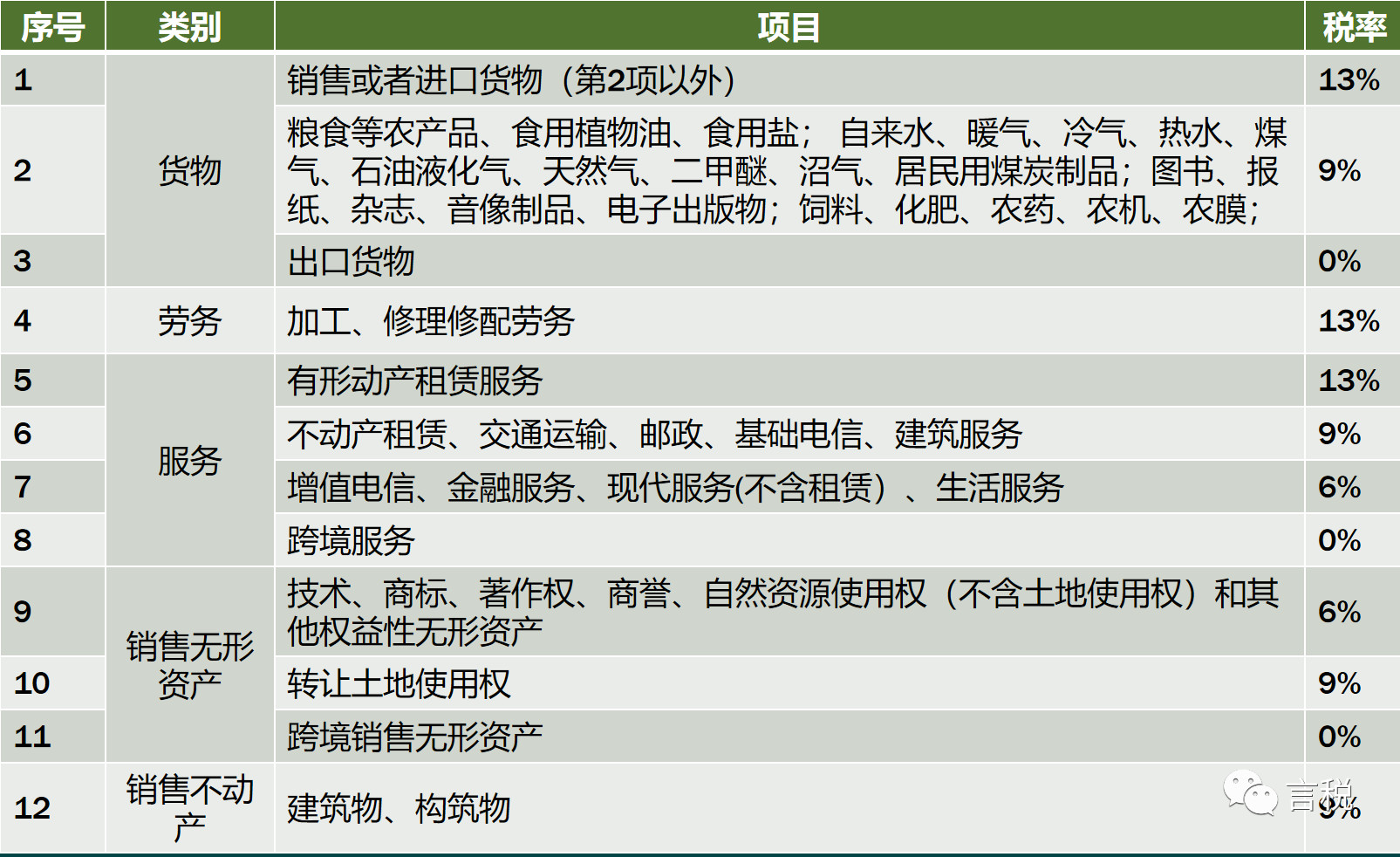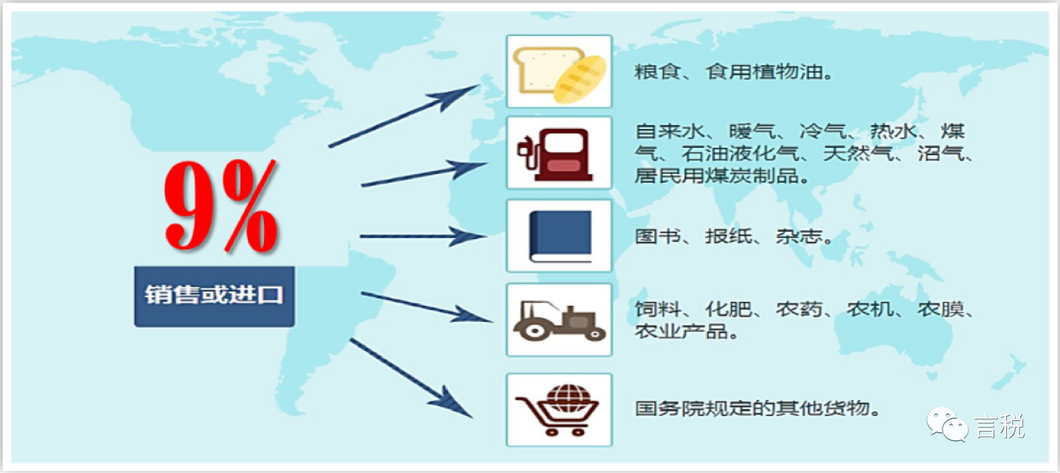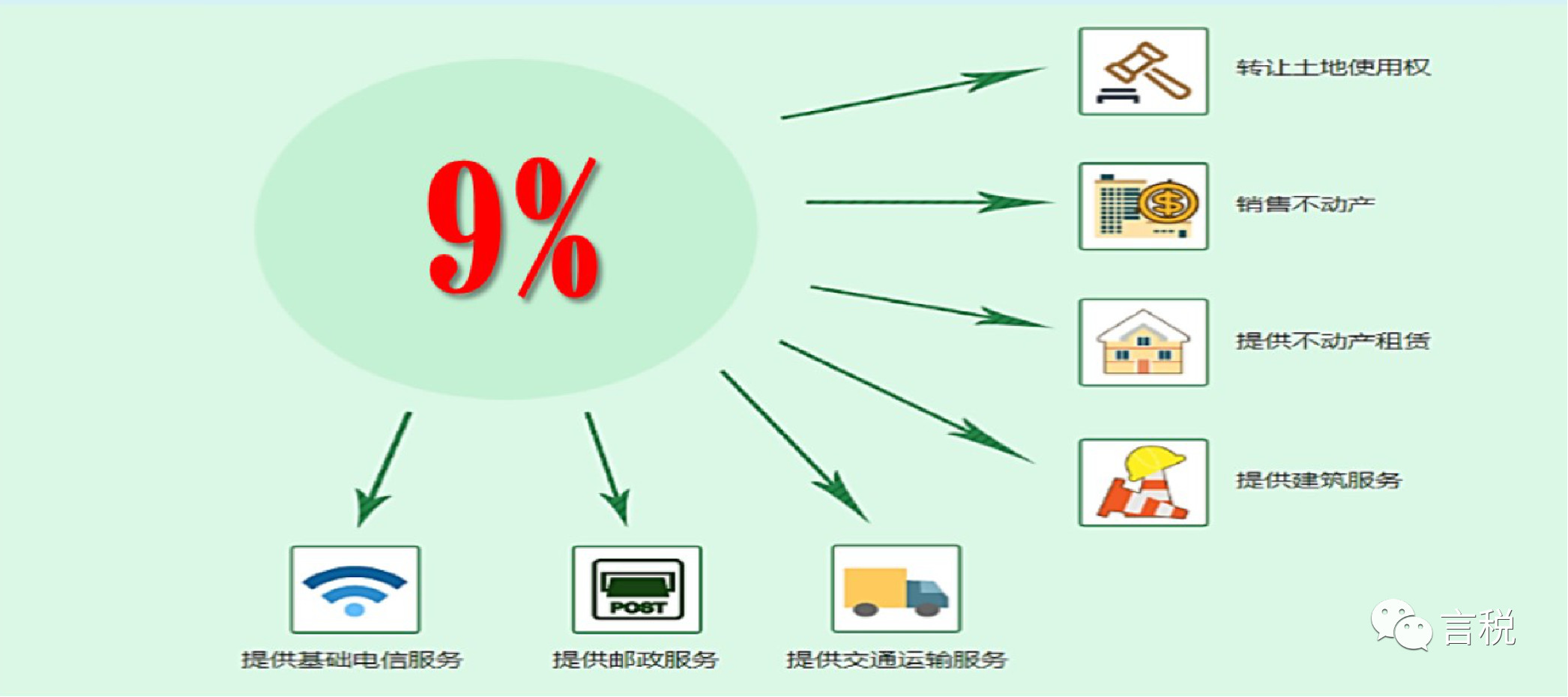 2、銷售交通運輸服務、郵政服務、基礎電信服務、建筑服務、不動產租賃服務,銷售不動產,轉讓土地使用權以及銷售或進口正列舉的農產品等貨物稅率為9%;