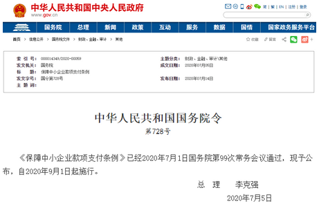 國務院總理日前簽署國務院令,公布《保障中小企業(yè)款項支付條例》(以下簡稱《條例》),自2020年9月1日起施行。