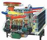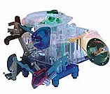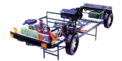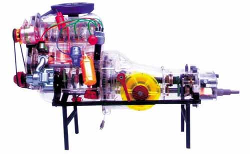 本品選用透明有機玻璃制作,內中部件均以硬質塑料料加工,用 螺絲固定在金屬高溫烘漆而成的車架上。各總成部分都以壓模成形加 工,代替過去膠粘合的方法,使產品在強度上有很大提高。發(fā)動機總成用電機驅動,在油門處設有調速裝置,能演示發(fā)動機轉速高低。離合器分離明顯,操縱靈活,離合器外殼整體壓模而成,變速箱和各檔齒輪用各種顏色表示,換檔靈活,手制動美觀。后橋外形壓模而成,內中主減速、差速轉動自如,輪轂剎蹄壓模成型,剎蹄可調節(jié),前橋輪鼓可調整,轉向裝置以及電瓶、油箱、水箱,制動管路分布清楚一目了然。電路采用對插件前后分布,燈架、風窗、儀表板、后燈架用透明有機玻璃壓模成整體美觀逼真。